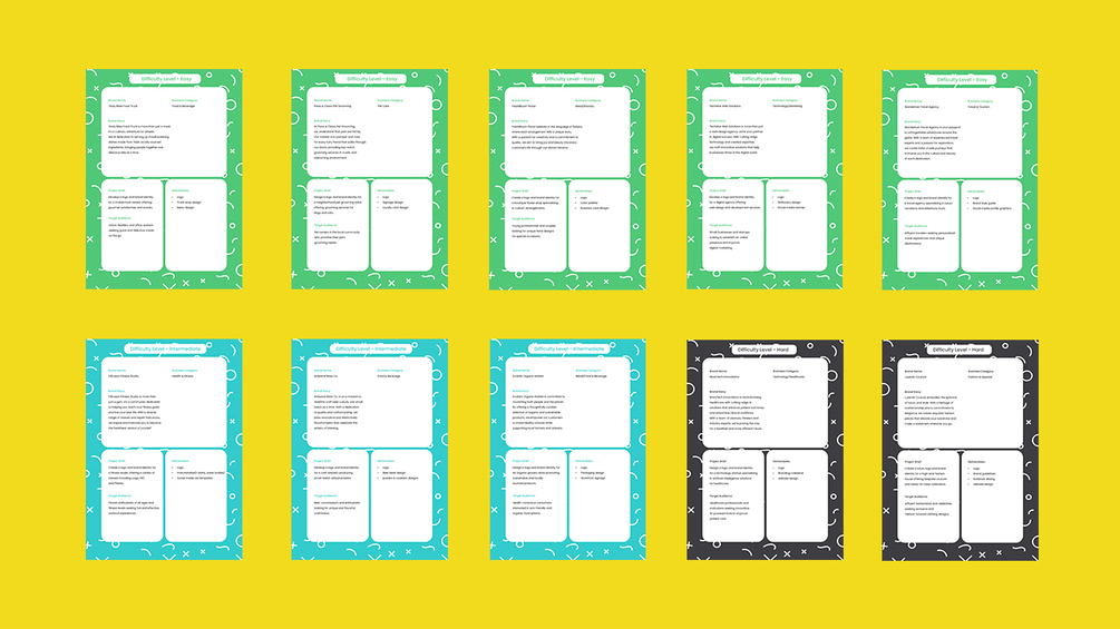 Every project brief consists of a fascinating company name, a captivating project description, a compelling brand narrative, and comprehensive specifications that encompass the business category, target audience, and deliverables. The briefs are classified into three skill levels: Easy, Intermediate, and Hard, allowing you to choose the one that aligns with your level of proficiency.